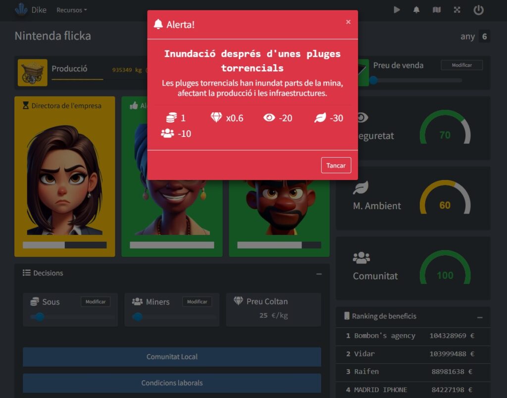 En les dues sessions posteriors els alumnes, agrupats en equips (“marques” o “empreses tecnològiques”), esdevenen propietaris d’una mina de coltan en un país del centre d’Àfrica i, a través d’una aplicació web, prenen decisions sobre la gestió del seu jaciment. Hauran de prendre partit en qüestions com el sou dels miners, les seves condicions laborals, la seguretat o el respecte mediambiental de la seva explotació. Finalment definiran el preu de venda del telèfon mòbil de la seva marca i competiran amb les altres “empreses” (equips de treball) per obtenir el màxim de beneficis i liderar el mercat de la telefonia. La simulació es perllonga sis anys, durant els quals es poden produir situacions inesperades (incursions de grups armats, desastres ambientals…) que doten de context el conflicte ètic que il·lustra el joc i que impacta directament en diversos objectius de desenvolupament sostenible (ODS) que s’esmenten el nou currículum de Biologia i Geologia.