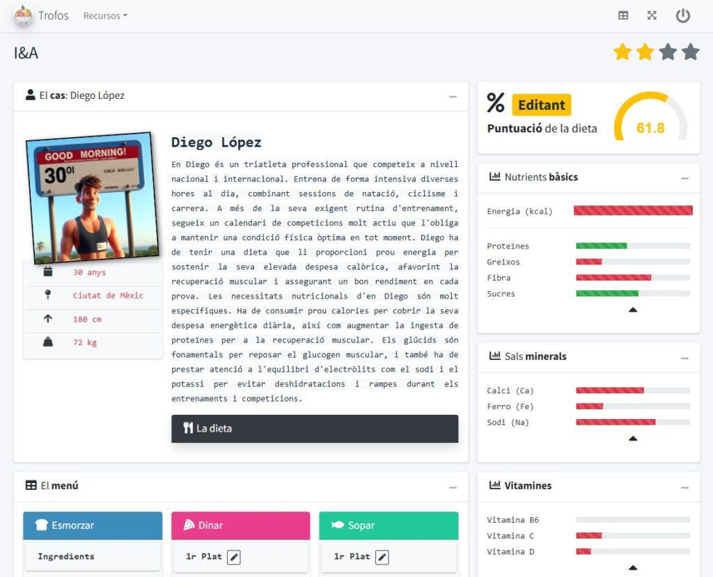 Trofos és una situació d’aprenentatge on l’alumnat, convertit en un nutricionista novell, rep l’encàrrec d’obrir una consulta virtual on atendrà pacients amb necessitats nutricionals diverses (des d’esportistes d’elit fins a persones diabètiques, celíaques o amb dèficits vitamínics). Haurà de preparar-los un menú d’un sol dia, que satisfaci els seus requeriments concrets pel que fa a una sèrie de nutrients escollits expressament i tenint en compte cada cas. Els casos es plantegen aleatòriament i ordenats per dificultat, de manera que, quan s’assoleixi l’objectiu per a un dels casos, el següent que es presentarà serà una mica més complicat. L’activitat contempla quatre nivells de dificultat, que incrementen també el prestigi, l’expertesa i el renom de la consulta del tèoric nutricionista.